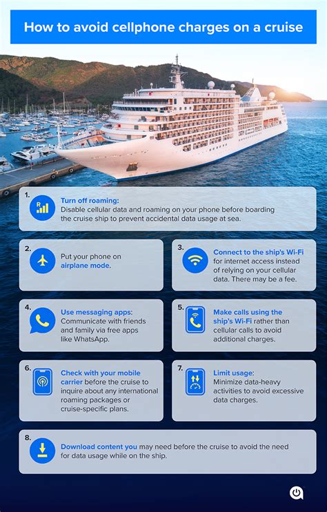 Additionally, reckon using messaging apps similar WhatsApp or Facebook Messenger that allow you lot to brand calls as well as post messages over Wi-Fi. These apps use minimal information in addition to can aid y'all remain inward affect amongst your loved ones without incurring extra charges. Finally, if yous call for to access the cyberspace for run or other important tasks, endeavour to do and then when the transport is docked at a port. Many ports offering free Wi-Fi, allowing yous to remain connected without paying extra.